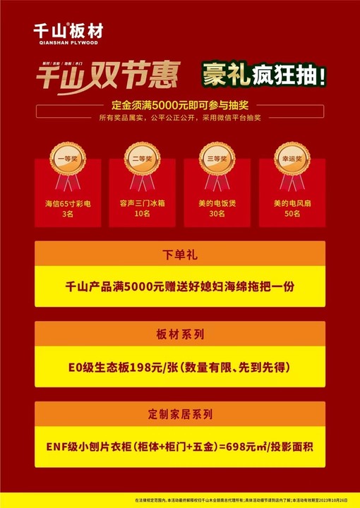 2023年9月26日,千山板材第五屆雙節(jié)惠暨千山板材新品發(fā)布會(huì)在江西省贛州市火爆開(kāi)啟!活動(dòng)時(shí)間長(zhǎng)達(dá)一個(gè)月,工廠直供,產(chǎn)品質(zhì)量?jī)?yōu)異,價(jià)格實(shí)打?qū)崈?yōu)惠!本次活動(dòng)不僅為消費(fèi)者提供了勁爆的優(yōu)惠政策,更是奉上了一系列驚喜豪禮與真摯服務(wù)。