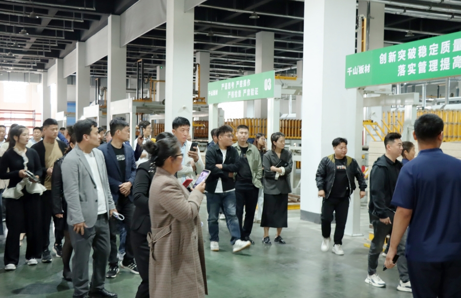學習會結束后,王殿忠經理帶領大家參觀了千山的現代化生產工廠,從板材品類、生產工序、檢驗出廠等方面深入了解板材生產環節。