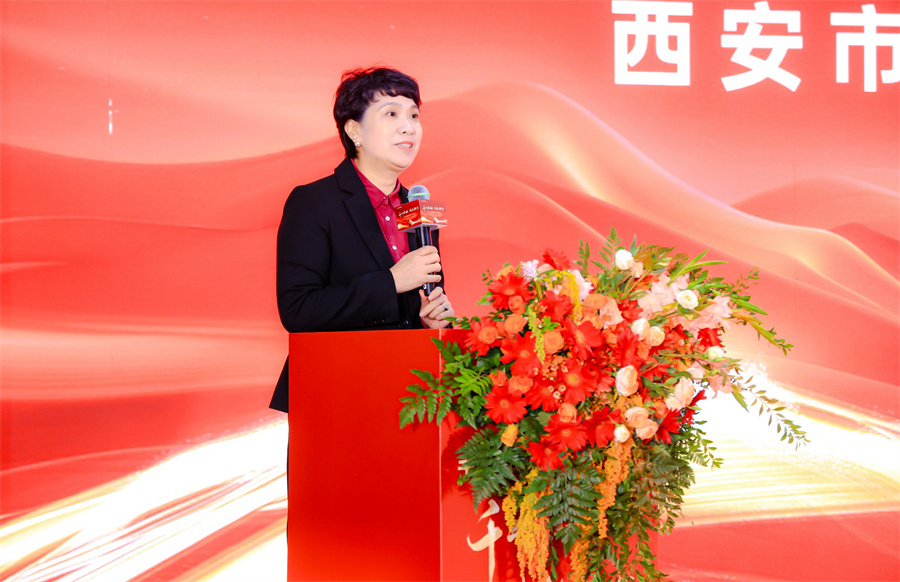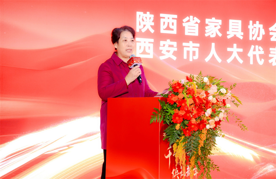 陜西省家具協會會長靳喜鳳女士上臺致辭。靳會長為陜西倉送上了開業祝福并表示,千山板材陜西倉是對家具產業鏈優化和服務升級的積極探索,是連接消費者與優質家具產品的橋梁,將為陜西家具市場注入新的活力。
