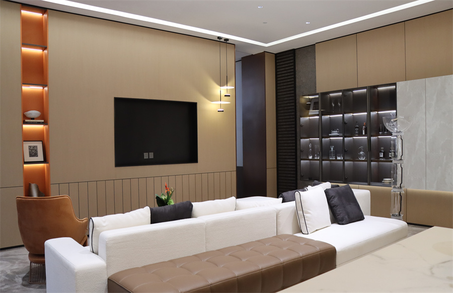 新中式與侘寂風相結合,保留中式的獨特韻味。展示柜2109淺棕×故宮紅,增加了視覺上的深度和質感。電視墻采用淺色石材紋理面板×夢幻敦煌,增添穩重質感。