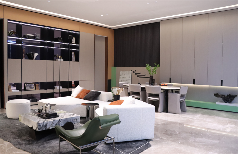 展廳五大空間呈現現代極簡、現代輕奢、新中式三大主流家裝風格,采用千山板材四大品類,糅合六大系列花色:木紋系列、純色系列、石紋系列、同步系列、數碼系列、PET系列,演繹多元化生活場景。