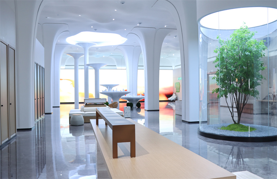 1500㎡現代美學空間,主中心以“生命之樹”為設計理念,營造自然與人文交融的場景化空間。吊頂以綿延的山脈形態表達千山砥礪深耕的工匠精神,樹冠形態的立柱寓意生命之樹的自然生長和璀璨綻放。