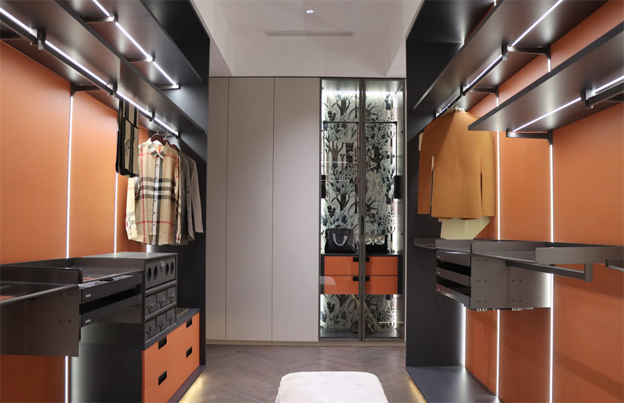 整體色調以深灰×西柚紅為主,形成鮮明對比,視覺效果強烈,秘境森林背板點綴整個衣帽間。置物柜采用當下流行工藝,四邊45°斜切,簡約風格深受年輕人喜愛。
