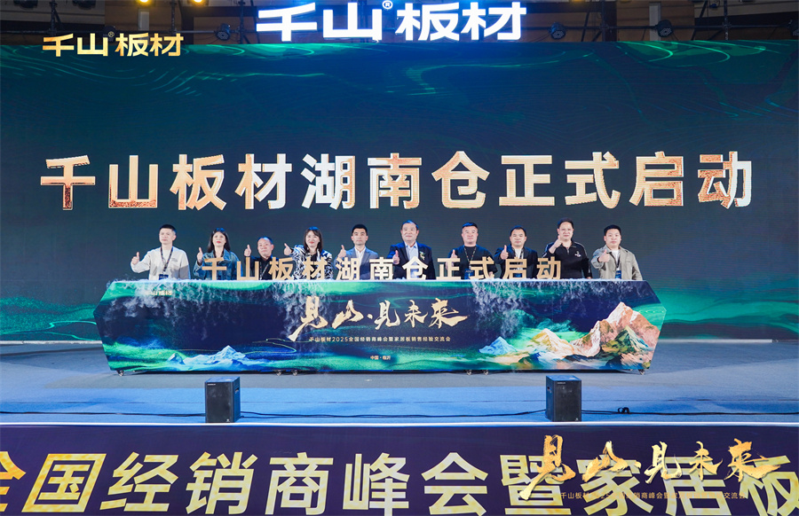 馬彥慶董事長(zhǎng)、王松副總經(jīng)理以及千山板材湖南倉經(jīng)銷商代表孫丁娟、李濤、李維新、肖曉燕、陳江南、李輝、劉凡華、周亮共同登臺(tái),攜手啟動(dòng)千山板材全國現(xiàn)貨倉第四大倉——湖南倉。