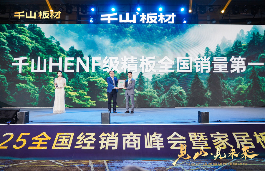 中國最具領(lǐng)導(dǎo)力和權(quán)威性的認(rèn)證公司——尚普咨詢集團(tuán),其資深合伙人曹頡先生親臨峰會(huì)現(xiàn)場(chǎng),為千山板材帶來極具分量的權(quán)威認(rèn)證——千山板材HENF級(jí)精板全國銷量第一!這一榮譽(yù)不僅彰顯了千山板材在市場(chǎng)上的卓越表現(xiàn),更激勵(lì)著千山繼續(xù)前行,勇攀高峰。