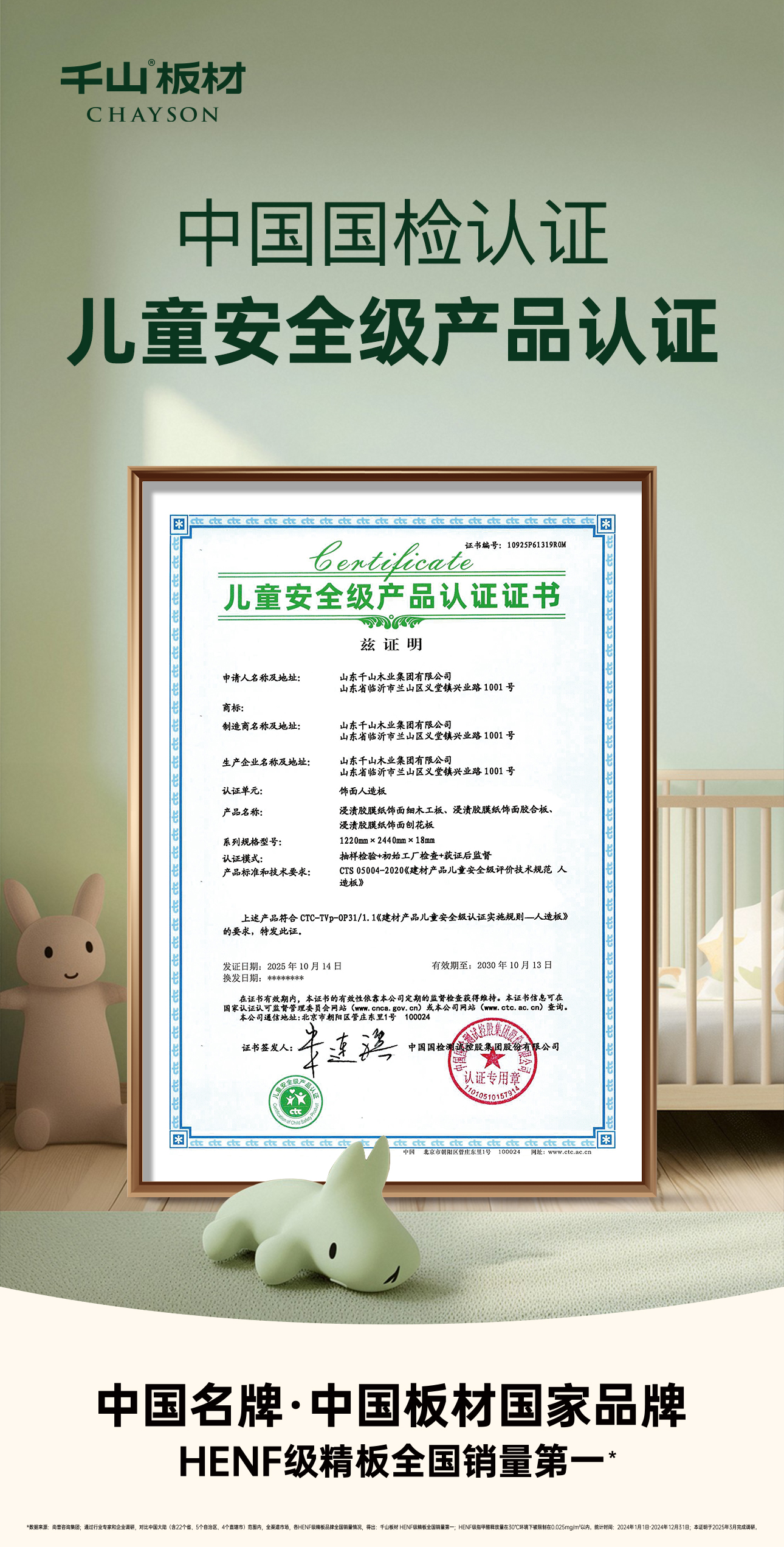 特別在孩子成長的世界里,每一寸空間的質(zhì)量、每一息空氣的安全,都牽動著父母的心。而千山板材憑借卓越的環(huán)保標準和安全性能,榮獲“兒童安全級認證”和“健康建材產(chǎn)品認證證書”雙項權威認可,為兒童家居環(huán)境筑起一道堅實防線。