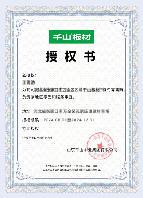 為了廣大消費者的切身權(quán)益和消費體驗,購買產(chǎn)品時,應(yīng)選擇千山板材授權(quán)的銷售渠道,可查看經(jīng)銷商授權(quán)證明文件。