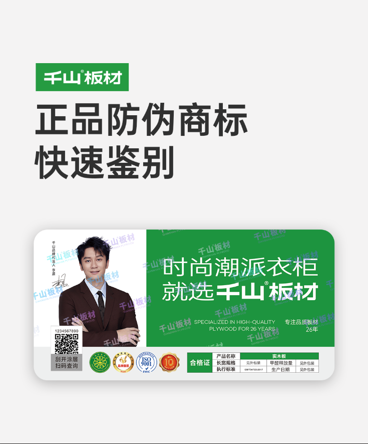 正品千山板材均有可鑒別、可查詢的防偽商標(biāo)及防偽編碼,刮開二維碼涂層,微信掃描二維碼,即可查詢驗證。同時,防偽商標(biāo)表面測光可見“千山板材”亮色水印。