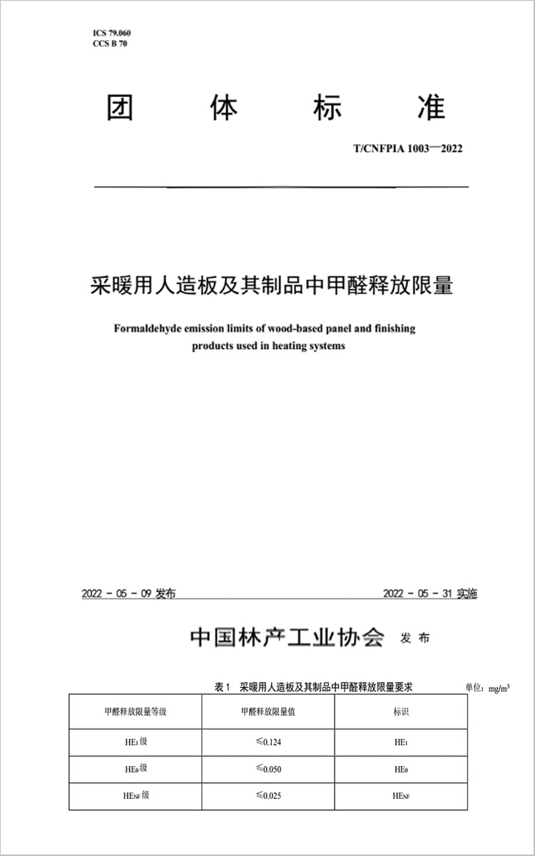 2022年5月31日開(kāi)始實(shí)施的T/CNFPIA1003—2022《采暖用人造板及其制品中甲醛釋放限量》文件,對(duì)甲醛釋放量有三個(gè)分級(jí),分別為HE1(≤0.124mg/m3)、HE0(≤0.050mg/m3)、HENF(≤0.025mg/m3)。